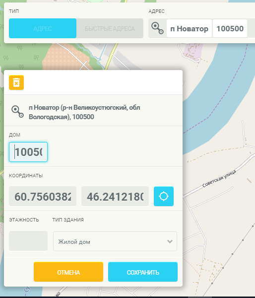 Предлагаем доработать возможность добавления координат непосредственно к домам без улиц. И ещё возможность оформления заказа без указания вообще номера дома, операторам приходиться ставить какой то номер - ставят 0 в основном.